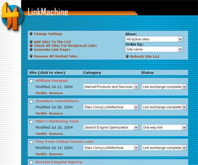 LinkMachine is a powerful tool to help webmasters connect their sites with other high quality sites by trading reciprocal links. Increasing a site's link popularity in this way increases its search engine ranking, traffic, and sales.